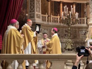 A közösség nevében Mohos Gábor segédpüspök köszönetét fejezte ki Erdő Péter bíboros szolgálatáért, és egy Szent Istvánt ábrázoló kis szobrot adott át számára a tisztelet és összetartozás jeléül.